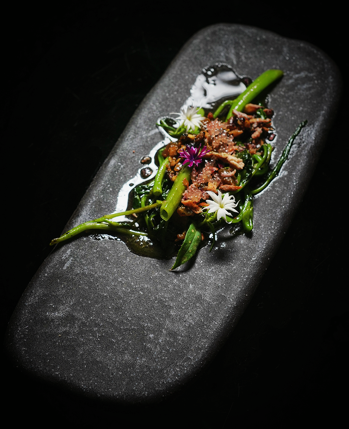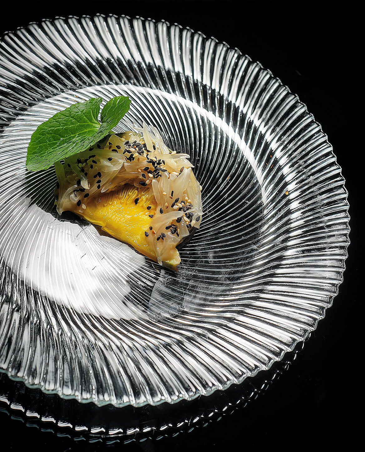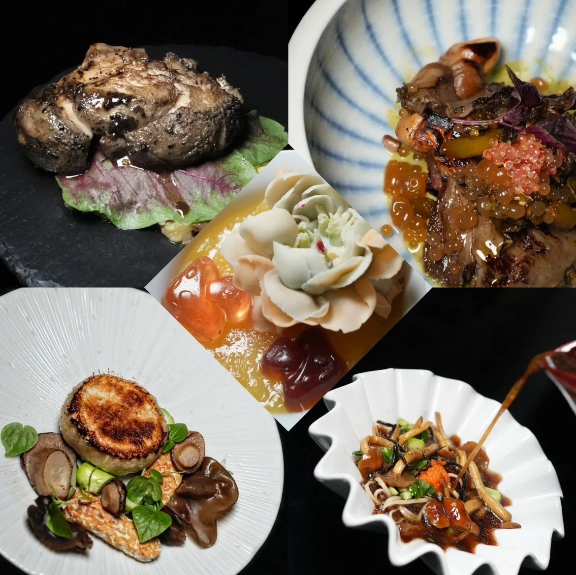 Daikon pot plant of raw baby veggies, black tahini soil Grilled exotic mushrooms stuffed in a double side crispy pie Yuxiang roasted eggplant in pickled chill and ginger sauce, Chinese donut Rock sugar and Chinese five spice braised lions mane mushroom Matcha cashew cream filled chocolate cannoli with plant honeycomb and almond dust