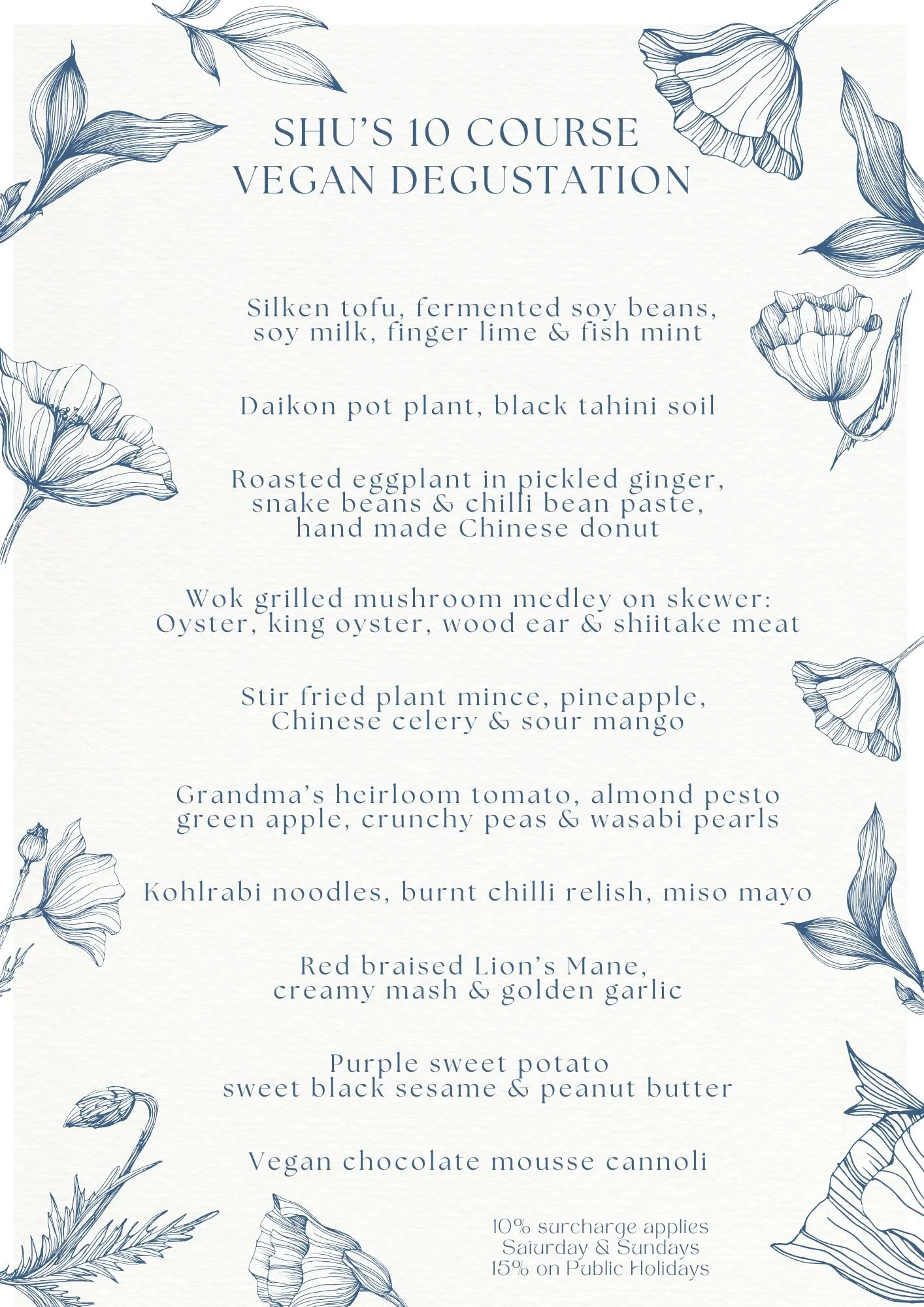 This signature set menu of Shu's celebrates the vibrant vegan Sichuan cuisine that Shu grew up with. Each course showcases the classic flavour and locally sourced ingredients. Complimenting wine package including a cocktail on arrival, 3 glasses of premium wines with dinner and a dessert wine with dessert. This menu is ideal to accompany your intimate date night, celebration of your special occasions or just simply a night of food safari!