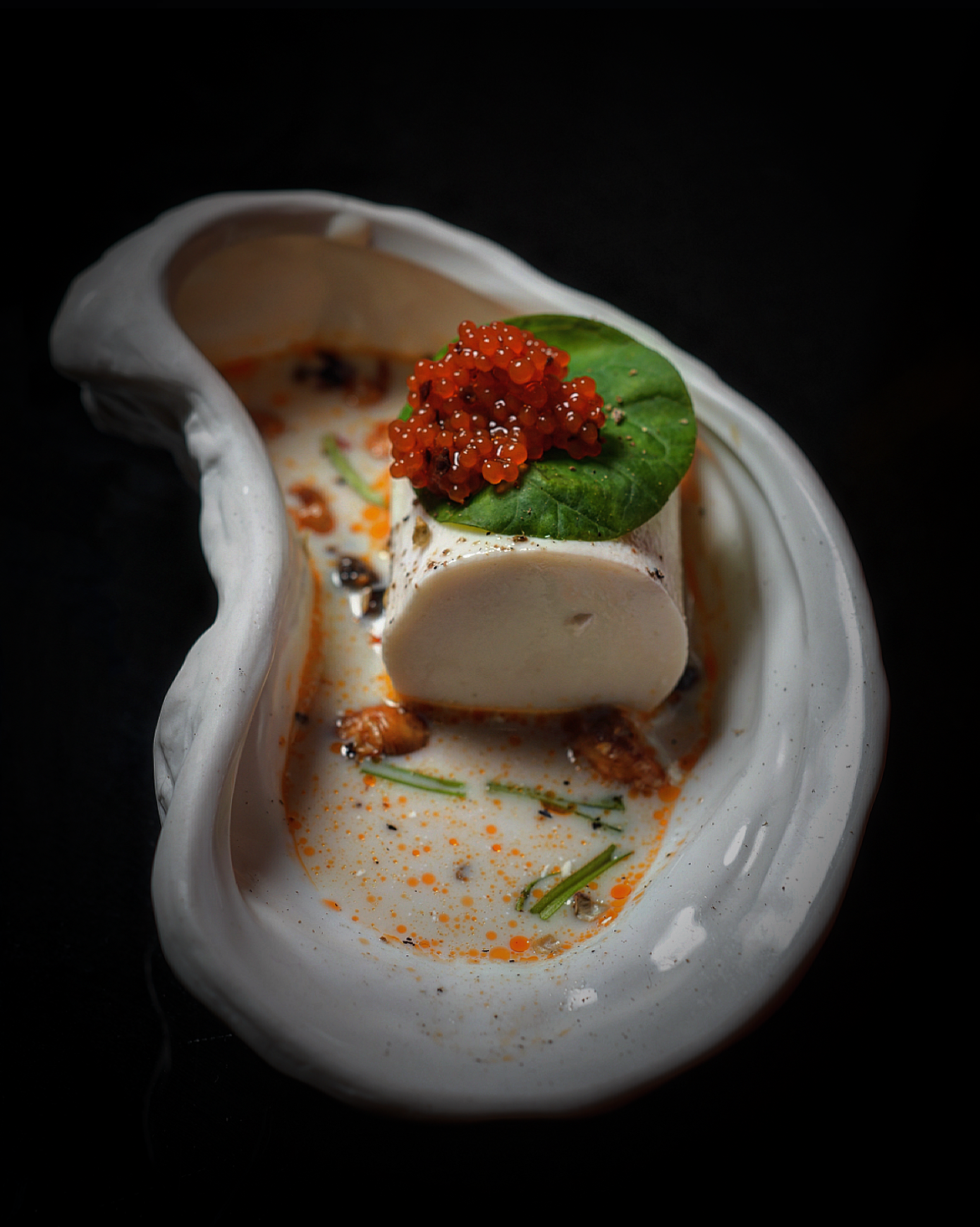 Chilled silken tofu with fermented soy beans, seaweed caviar, and fish mint (silky, savoury, and cooler than you'll ever be).