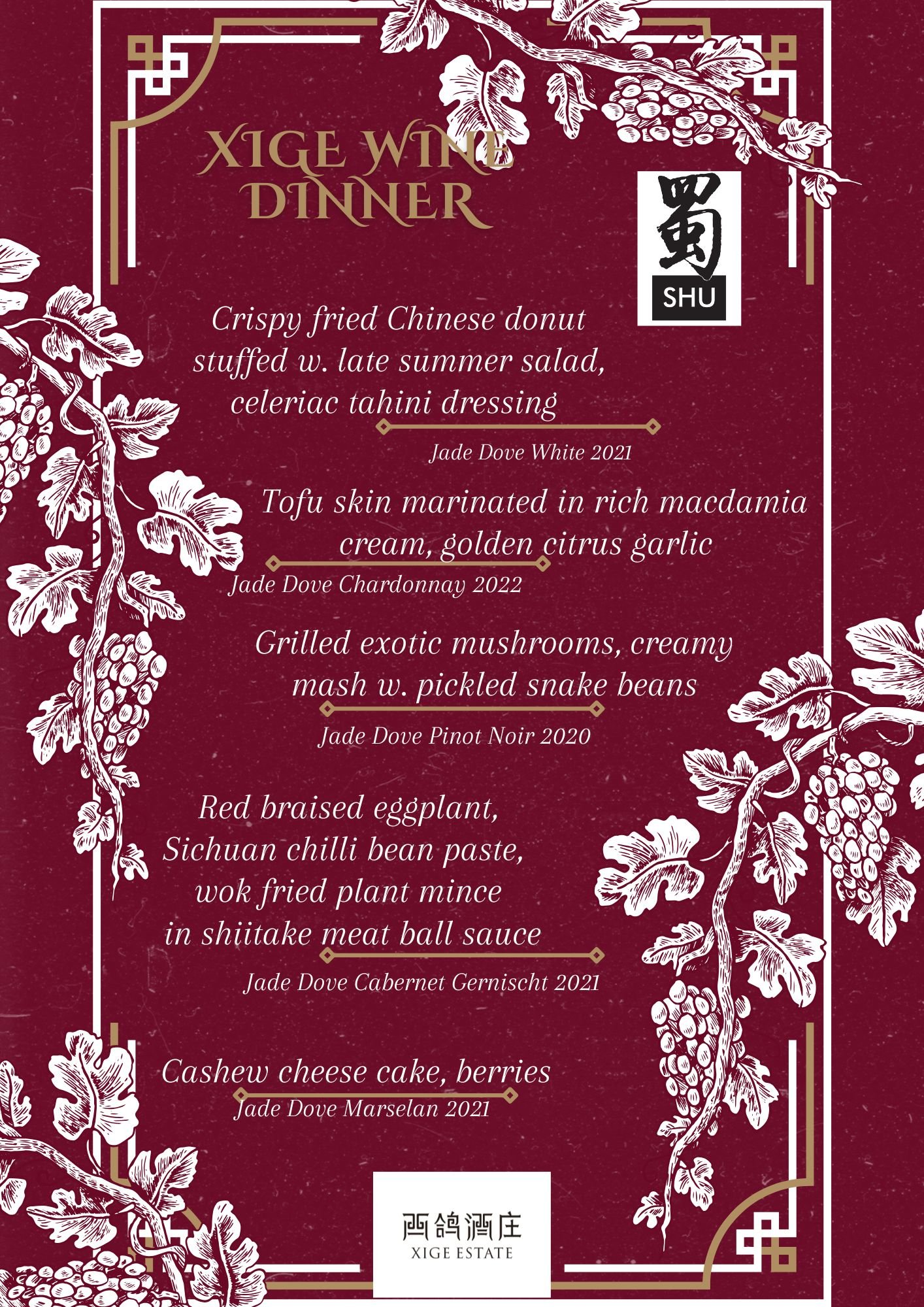 5 course specially curated for a tasting of Xige estate’s latest release. Meet Christelle Chene and have a conversation of up coming Chinese fine wines from Xige.